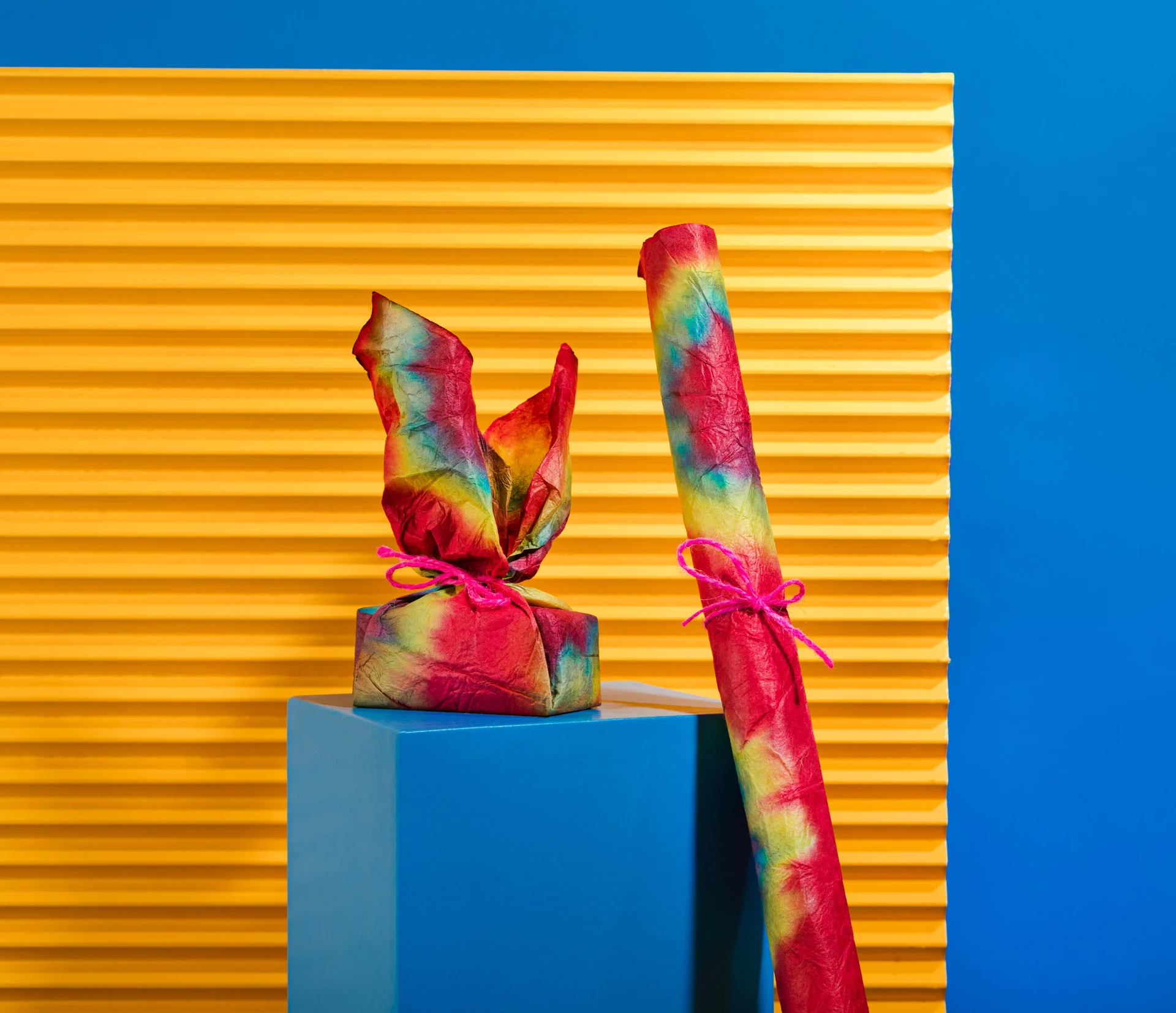 Inspired by the hippie tie-dyed fabrics of ’60s and ’70s, this Lokta paper wrap is handmade in a papermaking unit that was set up as part of a scheme to create employment for women. The Lokta plant is a regenerative fibre as it can be re-harvested after 3-4 years, and is dip dyed in Nepal. Thanks to its strong fibre, this wrapping is perfect to reuse.
